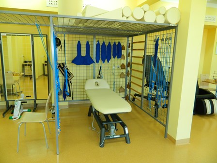 Na parterze łącznika zlokalizowano jadalnię, stanowisko recepcyjne, poczekalnię, węzeł sanitarny oraz salę rehabilitacyjną z zapleczem do ćwiczeń indywidualnych oraz boksem do masażu i stanowiskiem do elektro i światłolecznictwa.